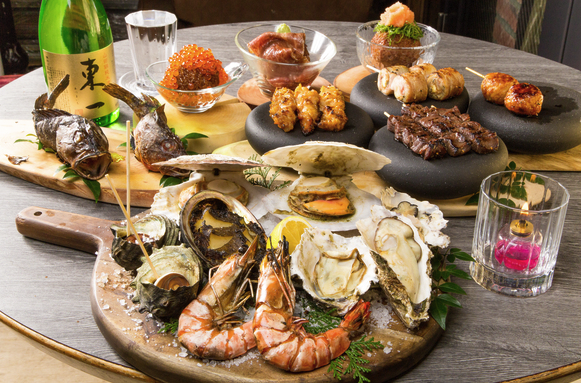 長浜直送の魚など厳選素材を贅沢に使用した海鮮料理や、素材本来の旨みを最大限に引き出す、炭火による迫力ある炉端焼きが楽しめるスポット。屋上テラスの夜空の下、BBQコースや土鍋のあるコースなどが飲み放題付きで楽しめます。