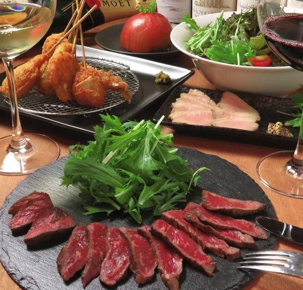 夜風が心地よいテラス席や、桜の一枚板が映えるバーカウンター、完全個室で、出しで食べる串揚げやステーキなどを飲み放題コースで楽しめるビアガーデンスポット。銀座で人気のお出汁で食べる串揚げと、和牛ステーキや和洋折衷の創作料理を銘酒とともに。