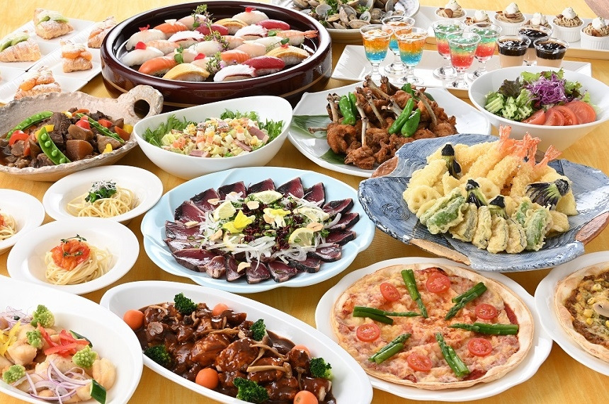 120分制の食べ飲み放題で、お料理メニューは70品以上もあります。ローストビーフや寿司、鉄板焼き、パスタやピザなどバラエティ豊かなこだわりのお料理を思う存分に楽しむことが出来ます!